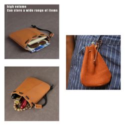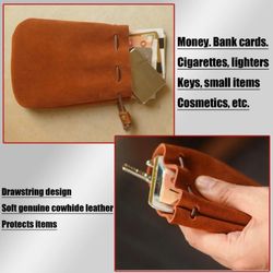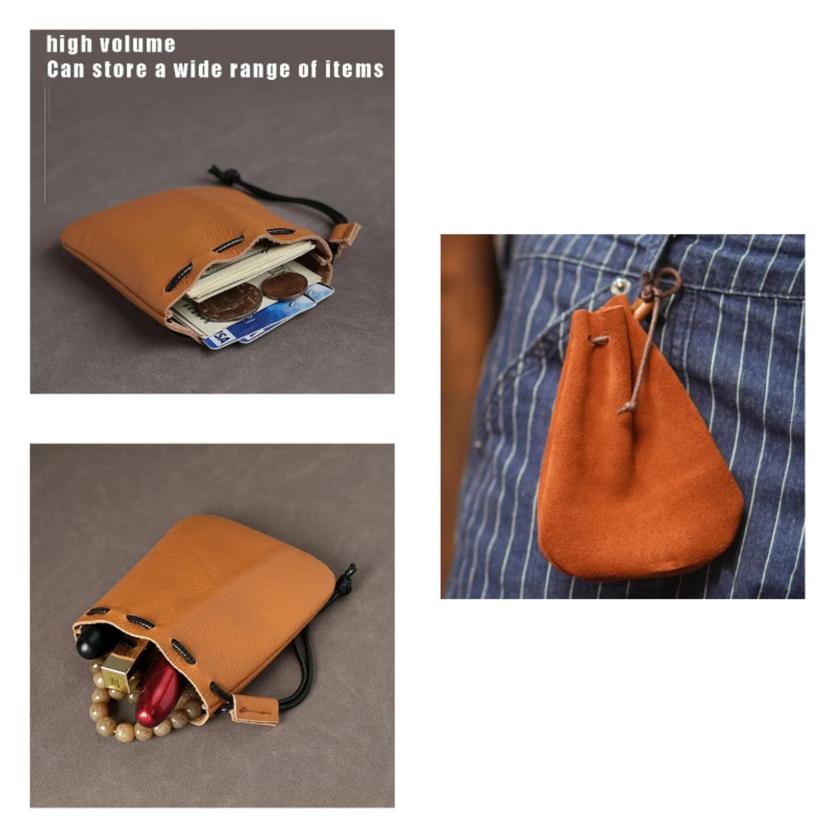 Crafted from premium top-layer cowhide leather with a vintage drawstring closure, this slim wallet features anti-loss card slots and an ergonomic grip. The retro design includes a detachable wrist/waist strap for hands-free carrying. It securely stores cards and cash while maintaining a compact profile that fits easily in pockets or bags. Ideal for travel, commuting, and daily use.